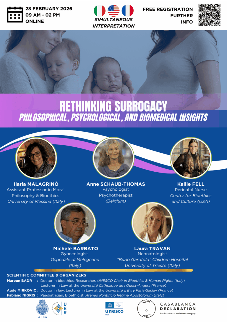 Faced with this global challenge, the Declaration of Casablanca for the universal abolition of surrogacy, signed by experts from all around the world, calls on governments to move beyond resignation, condemn surrogacy, take concrete measures to put an end to this trade and, especially, commit to an international Convention to promote a global context of refusal of surrogacy, likely to draw many countries into this virtuous wake.